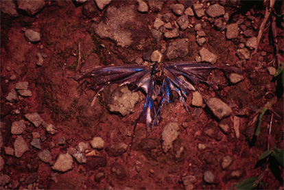 I took this shot of a blue morpho butterfly dead on the road in Quepos, Costa Rica in 1995. Impacts with cars, from butterflies to birds to bears, is very significant cause of the loss of wildlife around the world.